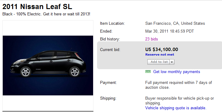 The first Nissan LEAF to go up for sale on eBay did not sell. This could be because of an unrealistic reserve price set by the seller, however the maximum bid placed provides us with insight as to the demand for this vehicle.