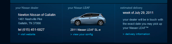 I got quite excited when I saw online that my expected delivery date for my Leaf was July 29th 2011. A week later an update showed August 1st 2011. Hey that’s just a few days, no big deal. Today I get an email indicating my delivery date has been updated, I check the website and now my delivery date is August 23rd 2011!! Yikes – that’s 3 weeks – in the wrong direction.