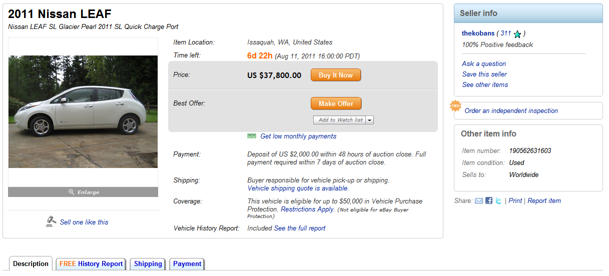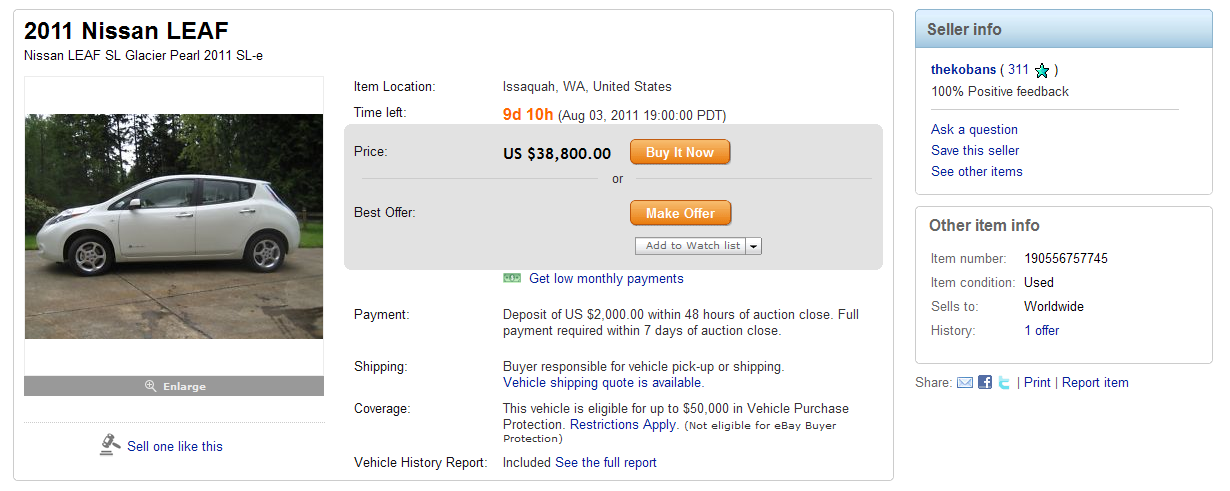 A seller in Washington State is offering a new LEAF for sale on eBay. The seller has a good reputation rating on eBay so should stand a good chance of a sale. With the 2012 model being released for sale any minute now by Nissan, one wonders how well this will sell.