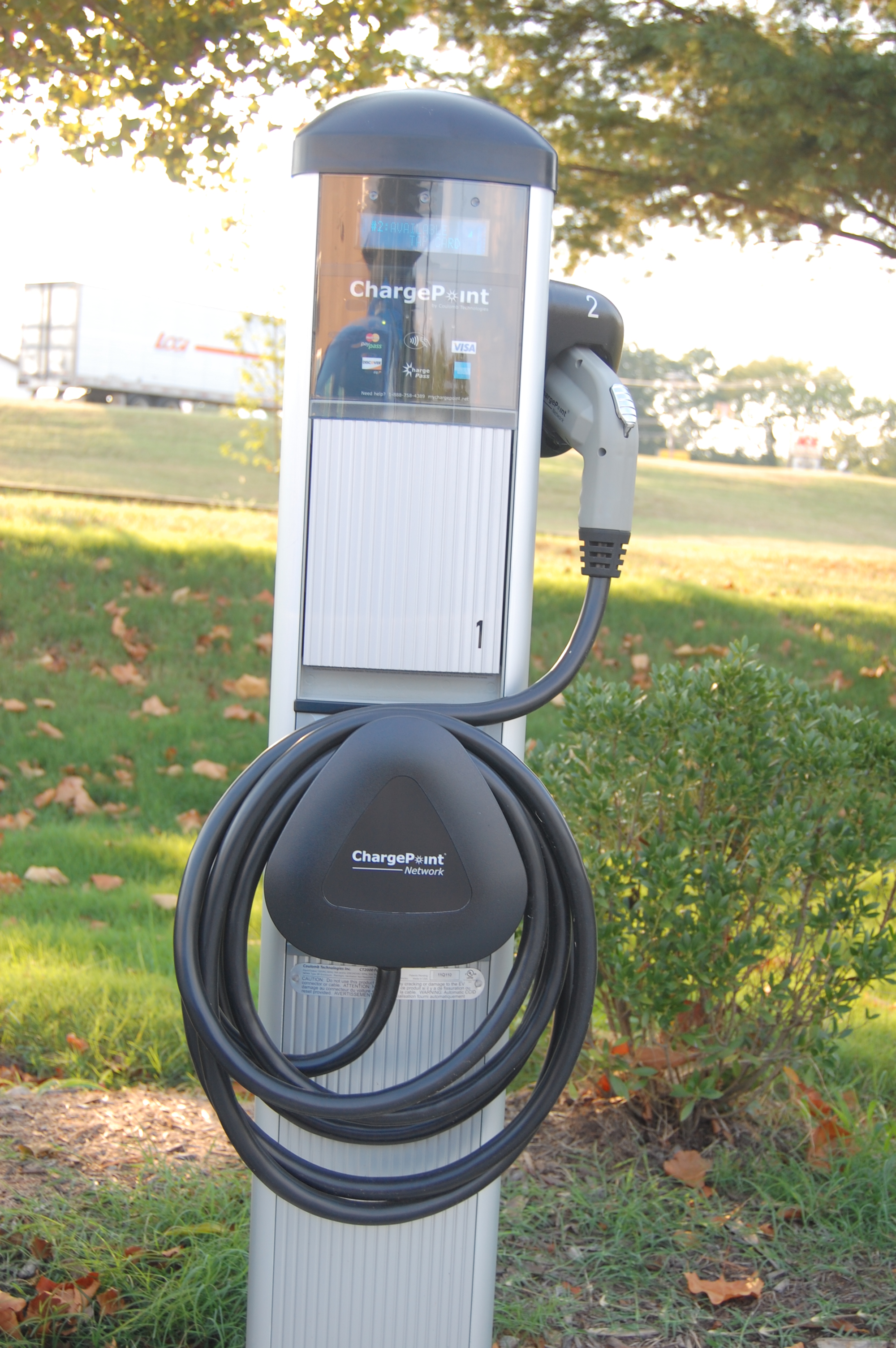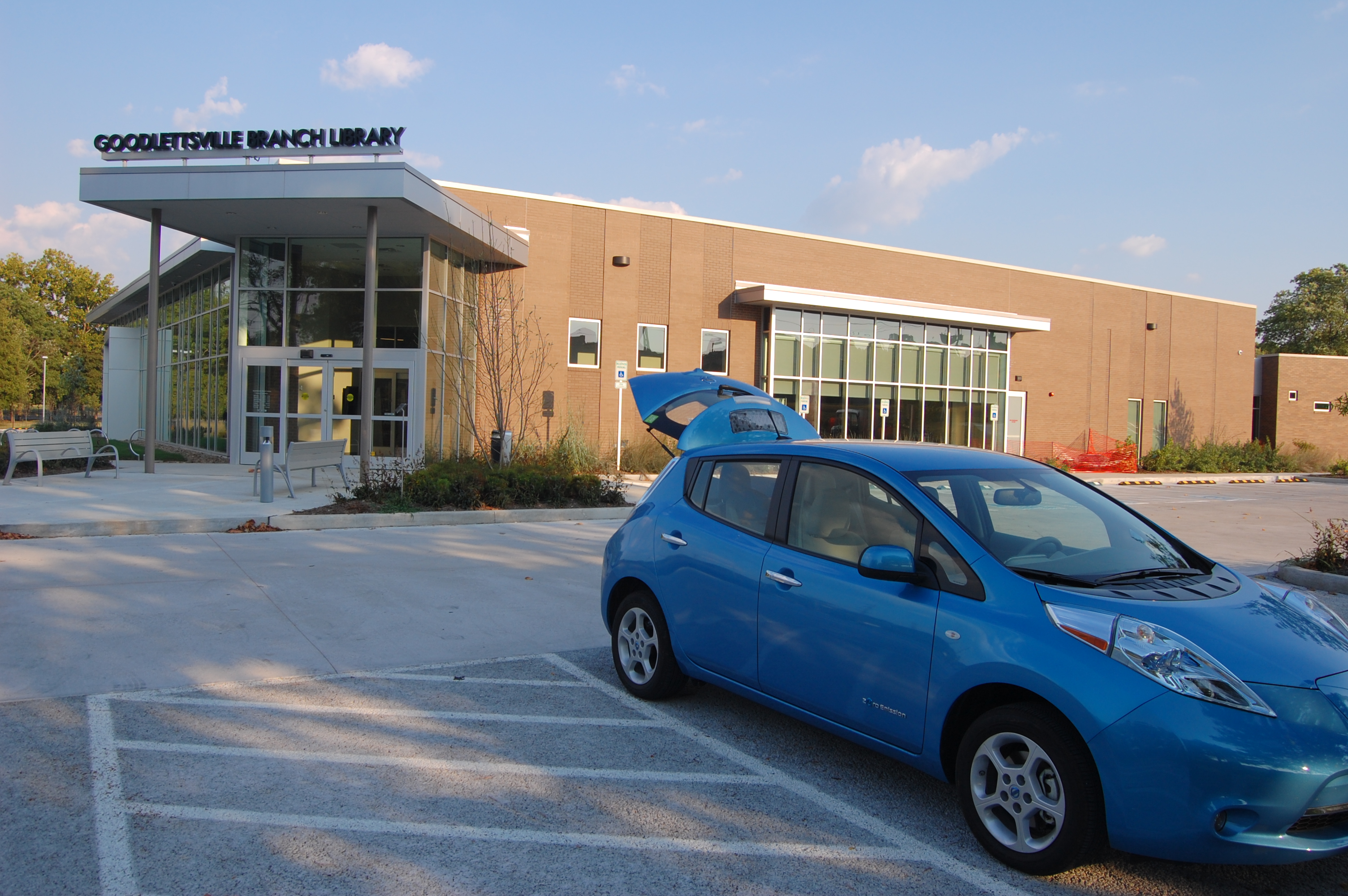 Goodlettsville is one of the first communities in Tennessee to install public access Electric Vehicle (EV) charging. The new library which opened in July 2011 was selected to receive two ChargePoint EV charging points. Each of the pedestals is capable of supplying either 110v or 220v to an electric vehicle. Level 1 charging can take 20 hours or more to charge an EV such as the Nissan LEAF from empty. The 220v Level 2 port however can do the same in 6-7 hours.This sounds like a long time, however most EV users frequently ‘top off’ their vehicles whenever presented with the opportunity, topping off typically takes anywhere from 30 minutes to a few hours. One reason to ‘top off’ like this is because many public charging stations such as the one at the Goodlettsville library are free to use, essentially giving the vehicle owner free motoring for a number of miles. Another reason is to ensure that enough range remains in the vehicle for unplanned trips throughout the day.