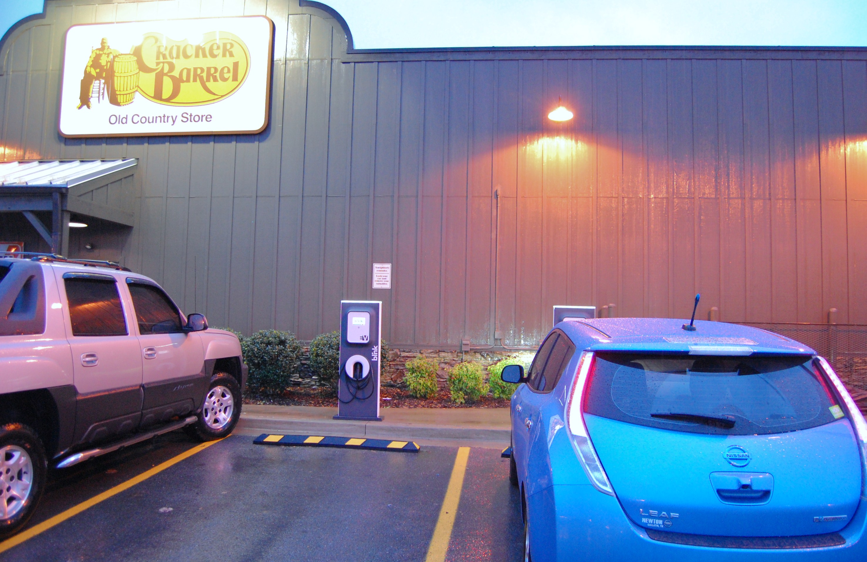 The Blink EVSE worked first time without any issues. It was a rainy morning, highlighting a drawback with public charging stations, you get wet when hooking up your vehicle. Situated on the side of the restaurant the chargers are close to a covered walkway which is good. Both spaces were open, no ICE vehicles blocking access, although all other adjacent spaces were taken. It is clear as you pull up that these spaces have a special purpose and other customers seem to be avoiding them without the need for special signage. Clearly not selecting premium parking spaces for the chargers helps alleviate the tendency for the spaces to be taken by non EV drivers. Well done Cracker Barrel!