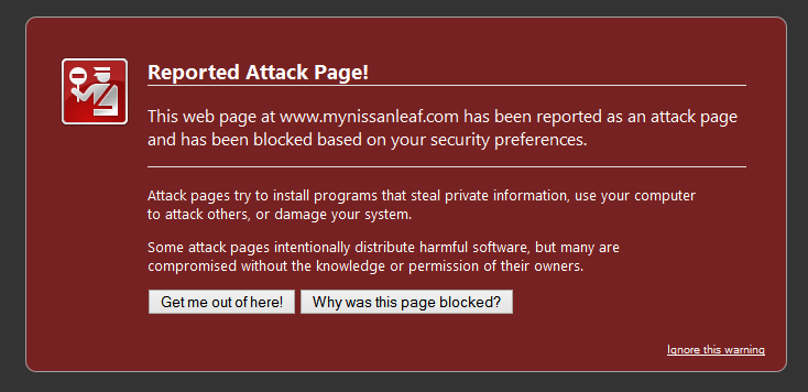 Sometime during Tuesday afternoon a third party Nissan LEAF forum, mynissanleaf.com got placed on a blacklist for malicious websites. Both Firefox and Google Chrome are advising against visiting the website. Visiting the website using Internet Explorer is NOT blocked, however after arriving at the site Windows asks for permission to install software, lending credence to the possibility that the LEAF forum has been infected with malware. Whatever you do do not install software from this website until the owners have had time to deal with the issue.