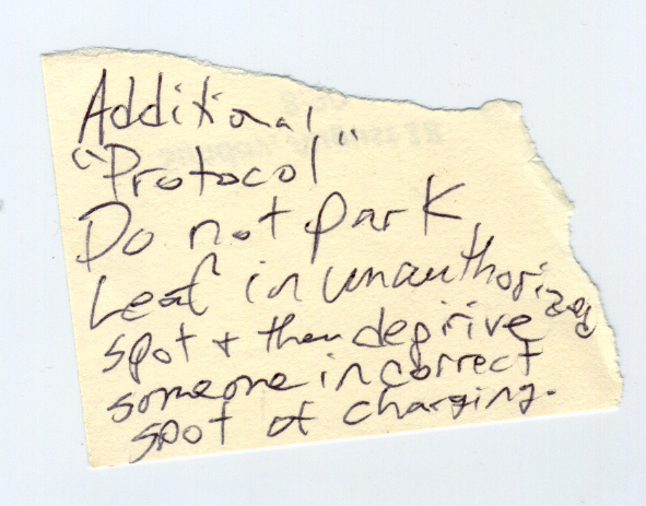Upon returning to my vehicle, there was a black LEAF in the spot previously occupied by the Lexus. I noticed a note on my car Window. The LEAF owner was clearly miffed. However rather than contact me and ask for permission to charge, the note indicated that I should not have charged my vehicle from an ‘unauthorized’ space and denied him/her a charge. The black LEAF’s charge port was locked, so I could not start a charge for the owner.