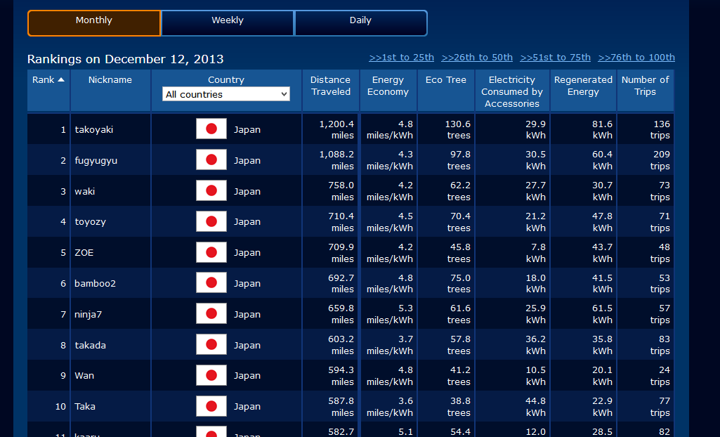 Something isn’t right I thought. Wondering if this is limited to my vehicle I looked deeper into the regional and worldwide CarWings data. I found that only 2 US drivers are in the top 100 worldwide for the number of miles driven so far in December 2013. Normally the US makes up about 50% of the top 100 high mileage drivers. Of further interest, included in the top 25 worldwide drivers, are all from Japan. So maybe the data loss extends beyond the US to all world regions except Japan? The Top worldwide mileage of 1,200 miles is about what one would expect at this time from the higher mileage LEAF drivers. Steve Marsh who is approaching 100,000 miles in his LEAF isn’t in the top 100. (Although this could partly be explained by the fact Nissan have lent Mr Marsh a car to be sure the car reaches 100,000 miles on December 16th when they will publicly recognize the achievement).