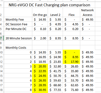 If you plan to rent an eVgo home charging station anyway, then you only have to fast charge charge 2 or more times per month for the NETWORK ACCESS plan to make sense.