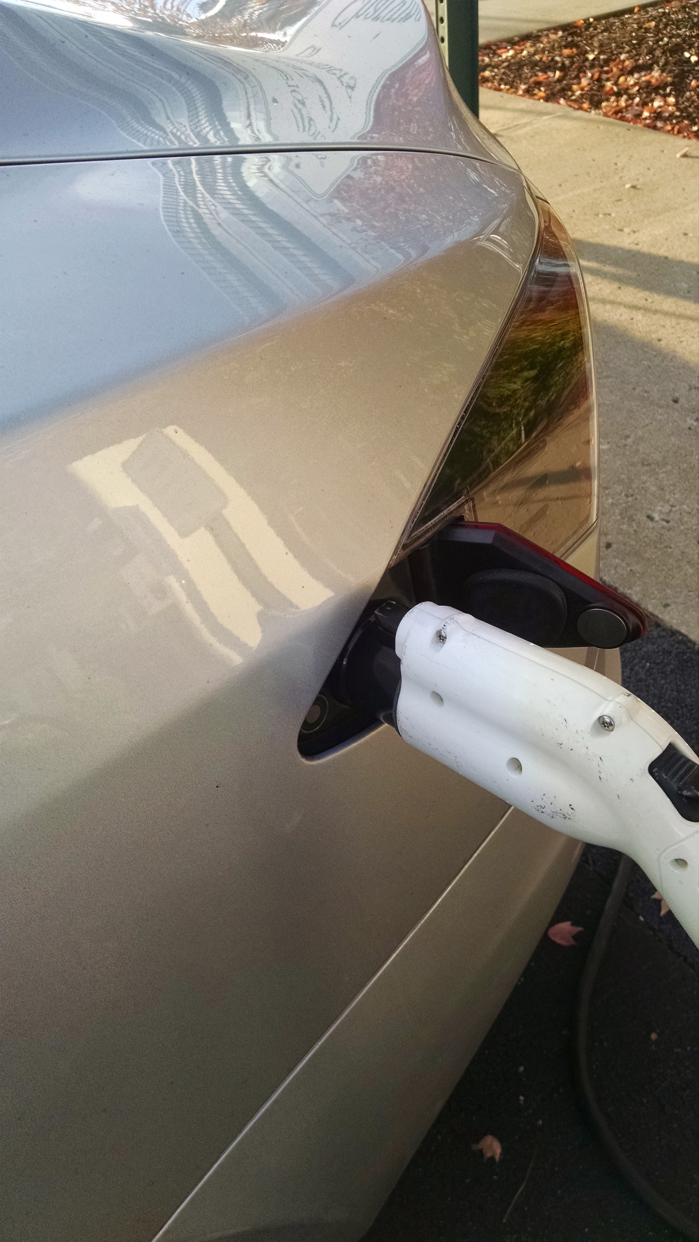 Model S charge port with standard J1772 plug inserted.