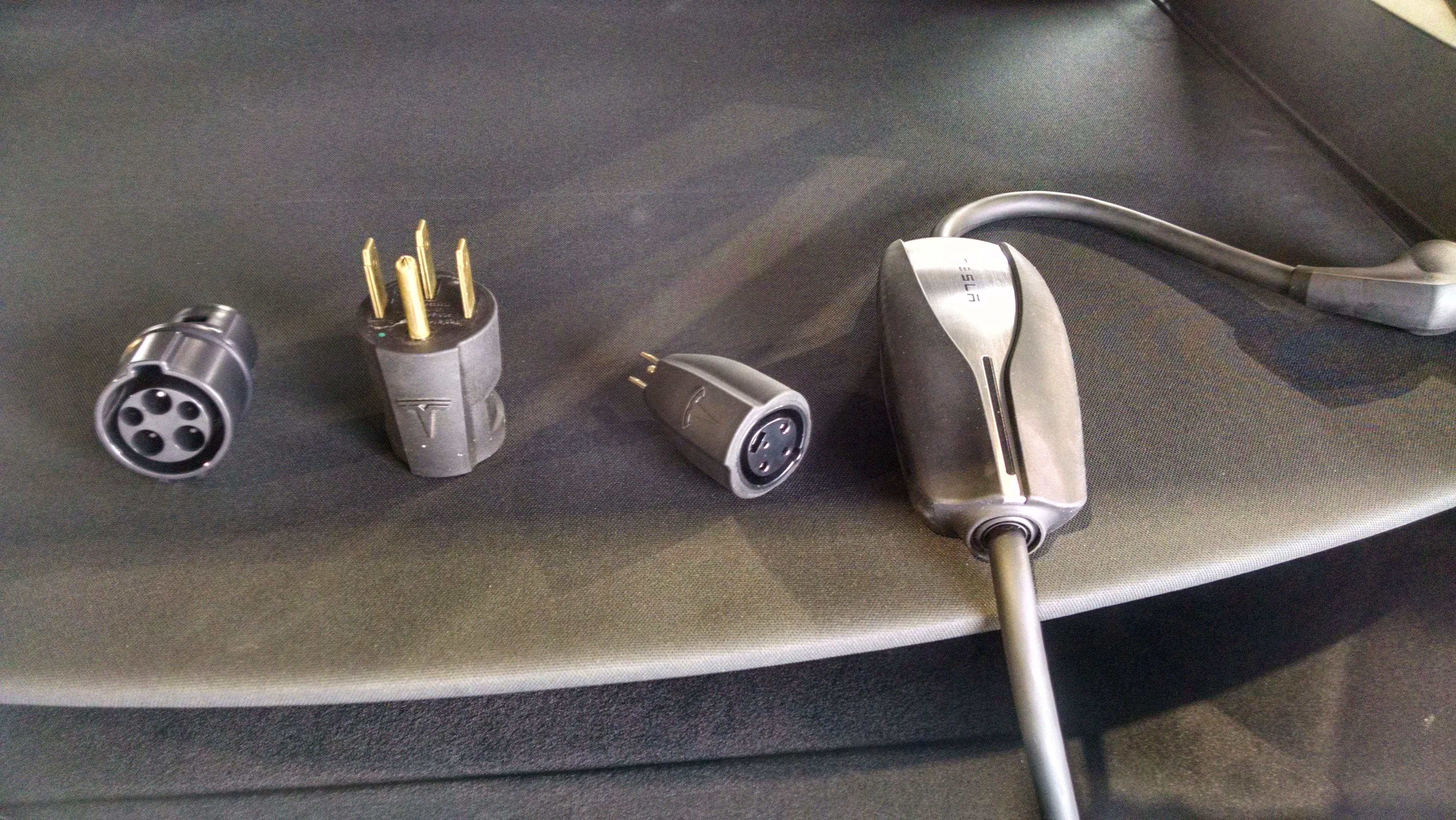 I spent sometime examining the portable EVSE and adapters that come with the Model S. The car on display had three adapters included, an adapter for standard 240v charging stations (J1772), an adapter for 120v outlets and an adapter for 50Amp/240v campsite outlets. I wish Nissan would provide a portable EVSE with adapters as well. I had mine converted for $300 and now have adapters, but the Tesla adapters are very compact and light.