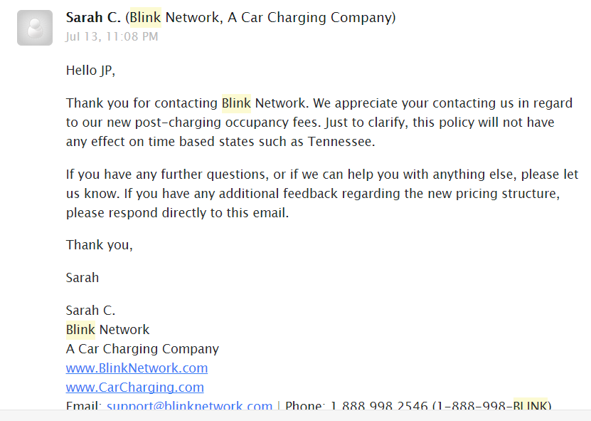 I reached out to Blink to enquire to see if the occupancy fee would apply to Tennessee Blink units. I got a very quick response from Blink. They assured me that no occupancy fee will be assessed for Tennessee charging stations since we already pay by the minute.