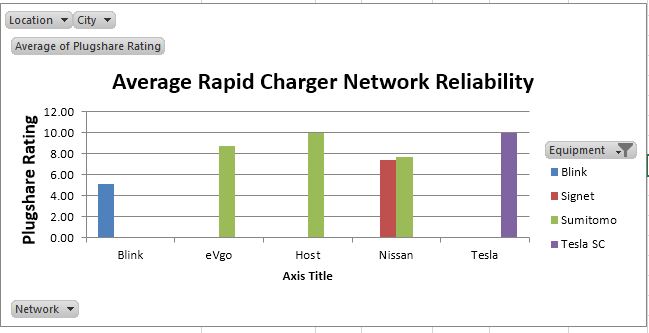 I broke out Nissan Dealer Locations from Nissan Corporate Owned Facilities. Dealers often get a lot of bad press for blocking the Rapid Charge Units with new or service vehicles and not maintaining the equipment adequately. The data reveals they fair much better than Nissan Corporate facilities, the dealers achieving a rating of 8.45, very comparable to the eVgo network. Well done Nissan Dealers!!