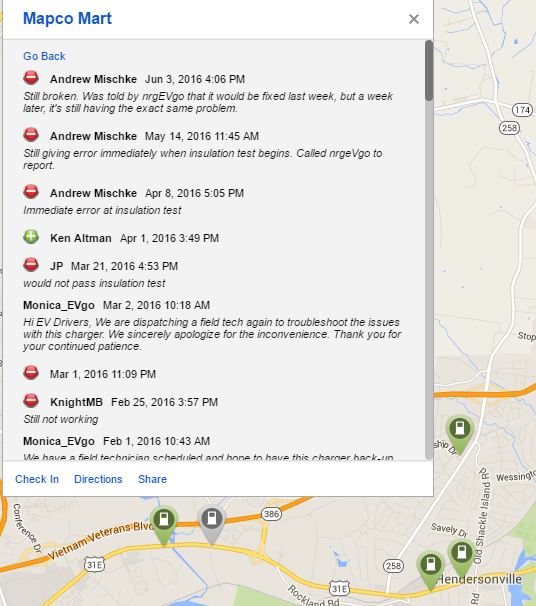 We’ve all seen gas pumps taped off and out of order at the gas station, stuff happens. However gas pumps rarely remain out of order more than a couple of days. At the Mapco Mart in Hendersonville TN, the DCFC charging unit there has been out of order since December 2015. When was the last time you saw a gas pump out of order for 6 months? Charging stations going weeks and months to repair reveals a reduced level of commitment or ability to repair the charging equipment. This stations owner, NRG eVgo is struggling to keep equipment running. Recently NRG energy spun the eVgo unit off as a separate entity. Charging revenue is inadequate and already the cracks are beginning to show.