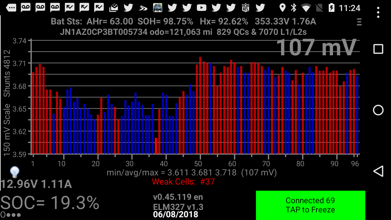 While the battery capacity trend is encouraging, I did experience a rapid loss of range recently near the end of a long journey where the battery was approaching the point where I would receive a low battery warning. I investigated the battery statistics when I got home and found that LEAFSpy Pro was indicating that cell pair #37 was weak. The car was at about 19% state of charge which seems reasonable for the 3.6 volts recorded. The reason the cell was flagged is because it varied from the rest of the pack by over 100 mV.