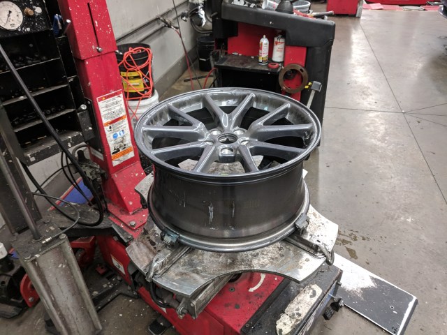 If you don’t have these pads then calling Tesla Emergency Roadside assistance is the safest option. In the photo you can see the Reverse Logic Jack Pad sandwiched in between the car and the lift. The Model 3 has foam glued to the inside of the tire to reduce road noise from the tires. To make the repair Tire Discounters cut a 3 inch square out of the foam to provide access to remove the screw embedded in the tire. The technician had to do the repair twice, the first time he had not removed all of the adhesive that holds the foam in place which caused a leak. Once the repair was good the tire was balanced and fitted back on the car.