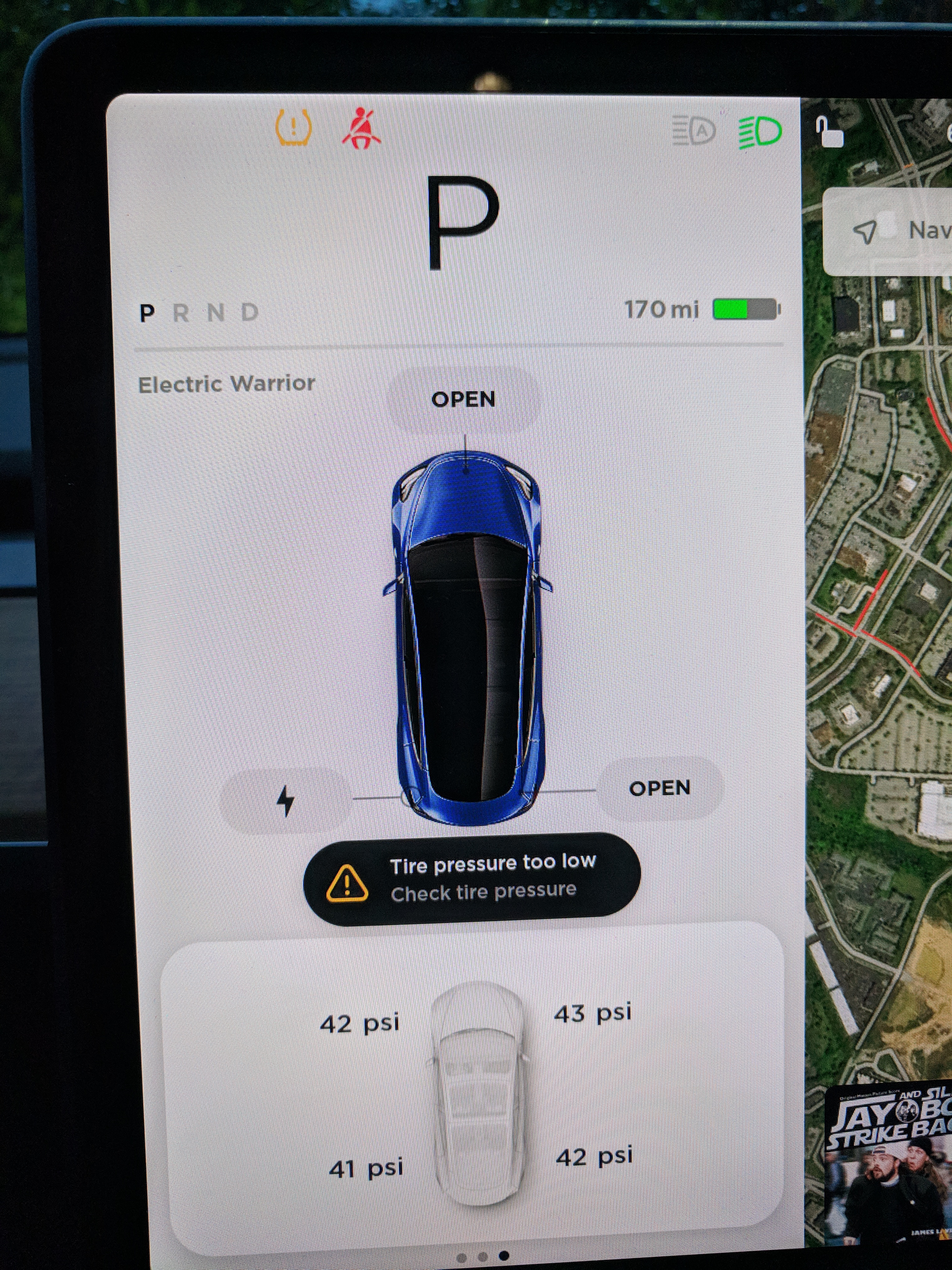 It was a cold, wet, dark ride home. I was tired and keen to get home. Then I saw and heard a warning on the dash of my Model 3 – Low Tire Pressure warning. The Model 3 displays the tire pressure on each wheel, I could see the rear right tire had lost over 10 psi and was at 30 psi instead of 42. After a few minutes it dropped to 29 psi. Rather than risk running the tire too low I stopped at a gas station and added air to the tire. After re-inflating the tire I could hear air escaping from the tire and it lost another 5 psi on the way home. Clearly this would not stay inflated until the morning to allow me to call by the Tesla Service Center, so I found the only tire shop still open at 6:30 pm. Tire Discounters of Hendersonville, TN.