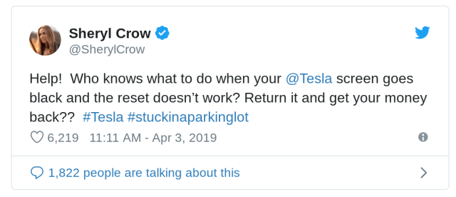 Back on April 3rd Sheryl Crow tweeted Elon Musk to complain she was stuck in a parking lot with a black screen. It turned out the screen brightness at night was turned down too low to see.
