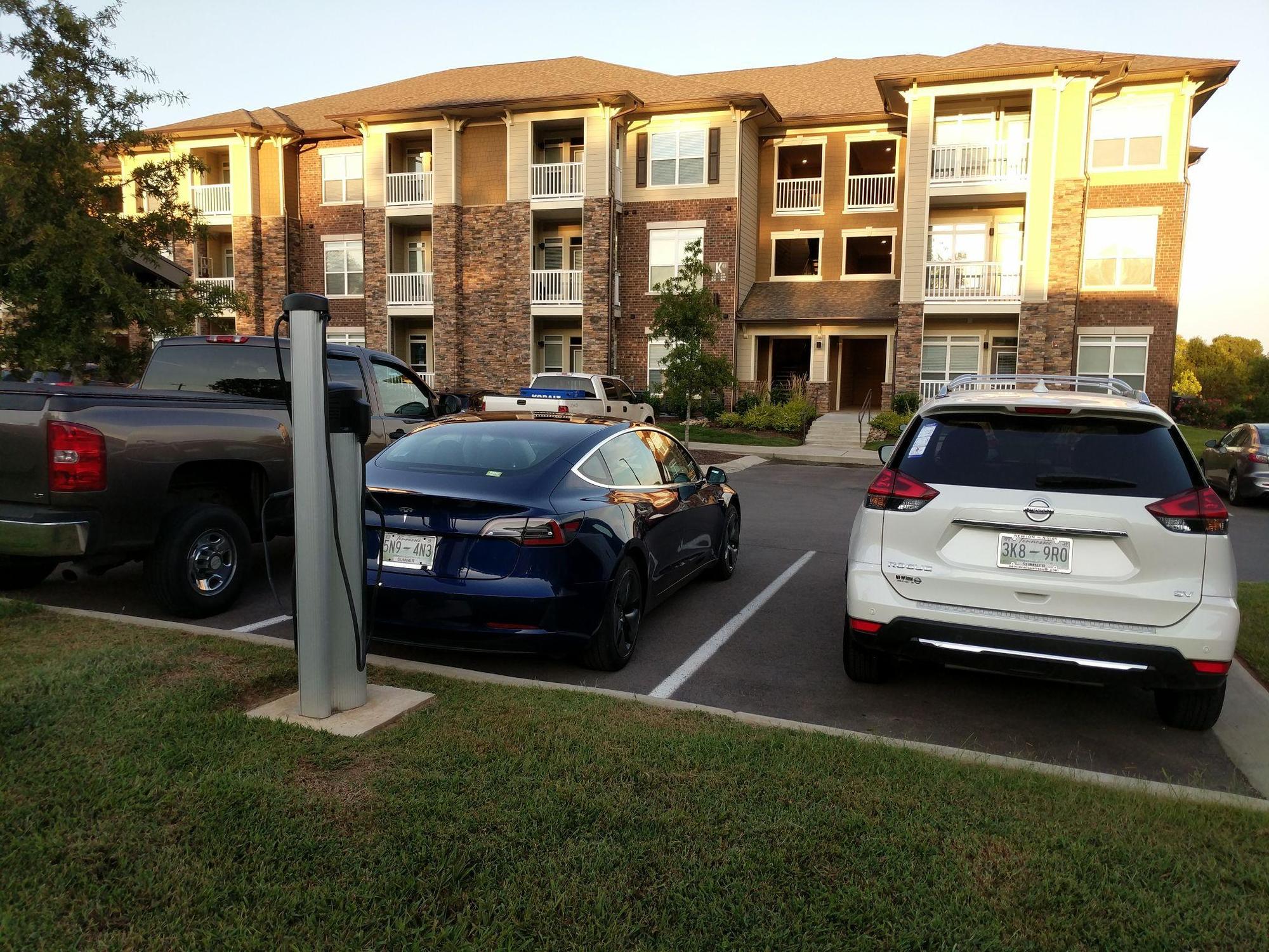 Apartment dwellers at Edison apartments in Gallatin TN now have a new option. The apartment complex has installed a ChargePoint EV charging station with the ability to charge two vehicles at the same time. The best part is that there is no fee to use the station. From a financial perspective Edison Apartment dwellers are better off than a home owner such as myself. The apartments shouldered the cost of buying and installing the charging station, will maintain it and also cover the cost of the fuel. Someone living at Edison apartments could have no fuel cost at all for their car. The convenience of plugging in in your own home can’t be beat IMHO, the apartment complex is quite big and one may have to walk quite a distance from the car back to your apartment. If however you live in block K at these apartments it couldn’t be more convenient.