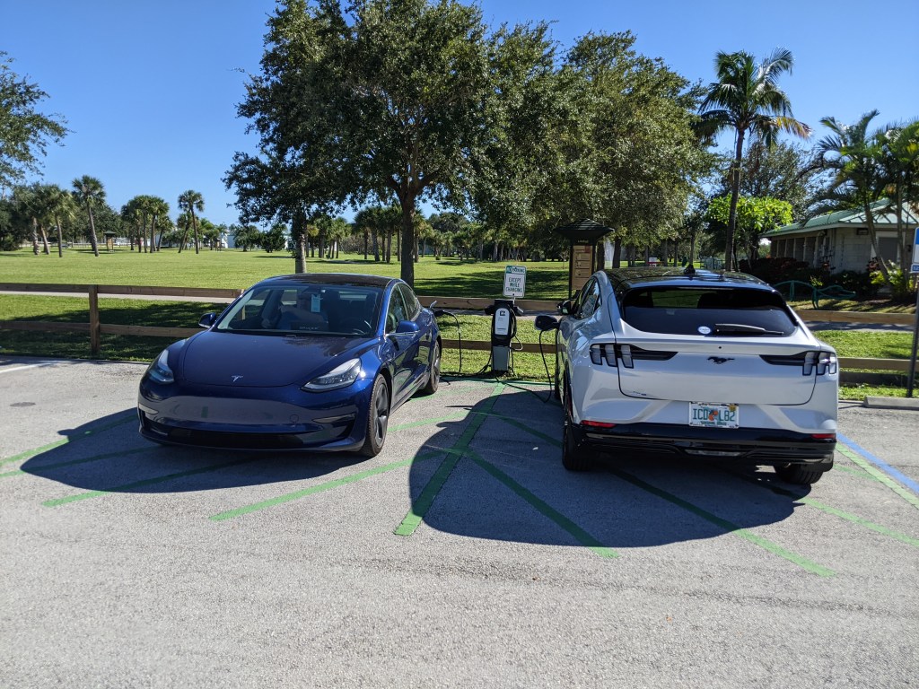 We toured the local area visiting a beach, restaurants and took an Airboat ride. Airboats need to be electric to make them quieter. Later we visited the Manatee Sanctuary Park which did have two J1772 charging stations. I plugged in next to a Mach-e while we explored the park.