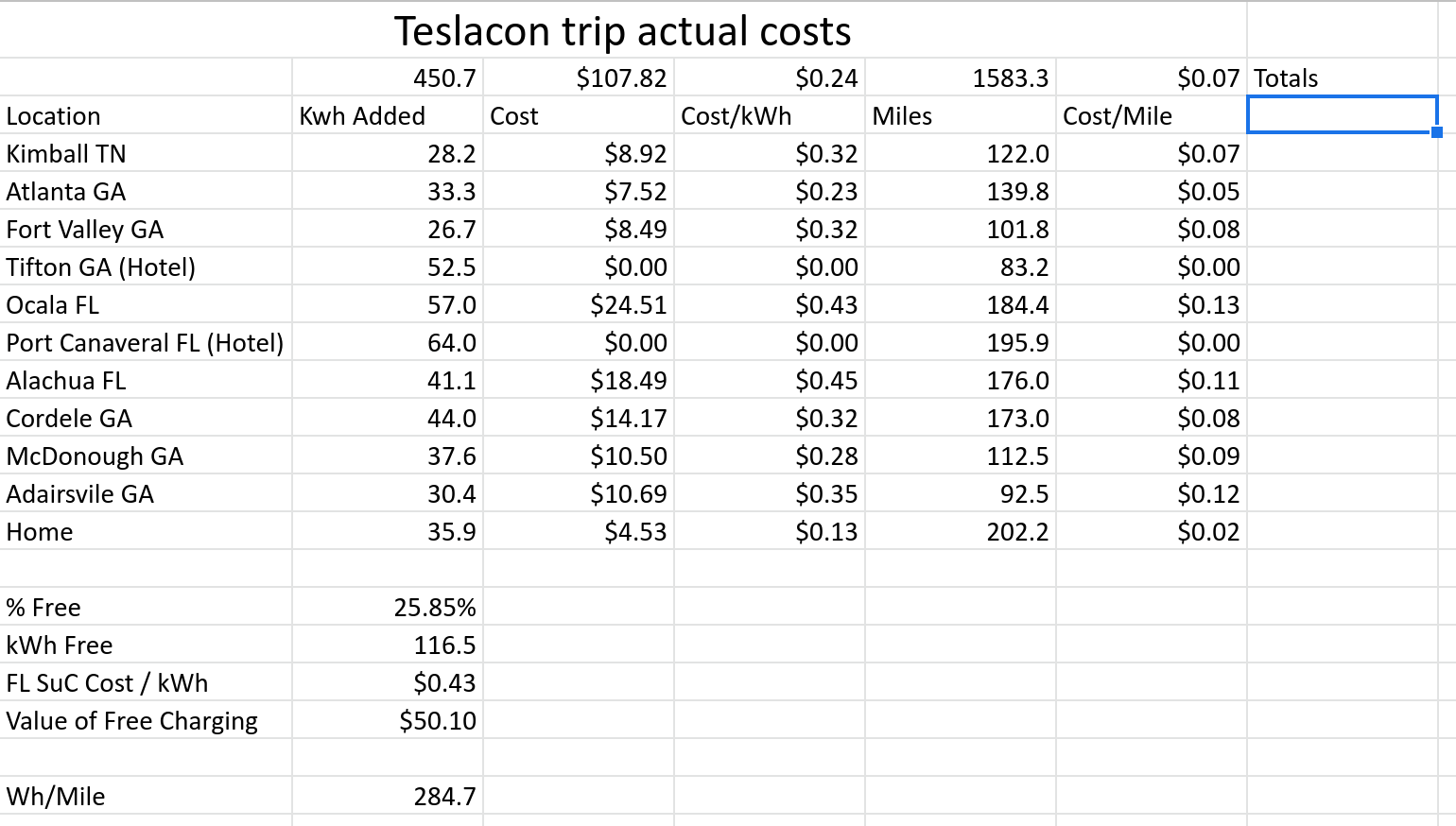 The journey was a round trip of 1583 miles with 450 kWh of energy used. I averaged 284 Wh/mile.