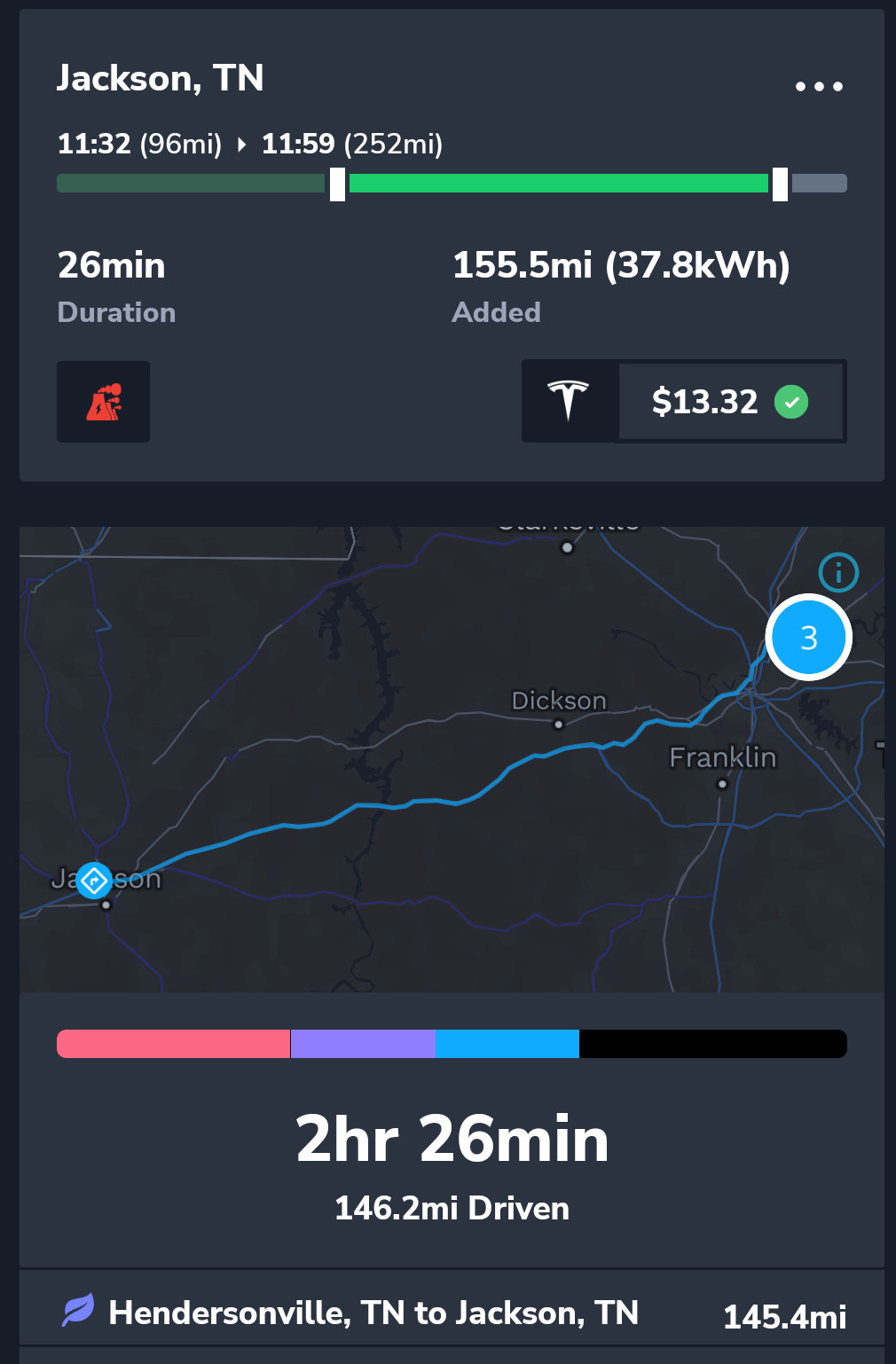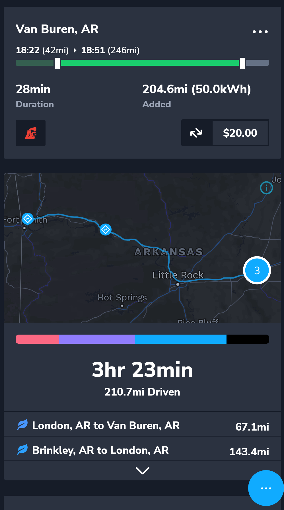 Arkansas has a slightly higher speed limit at 75 mph which allowed us to make better time. Arkansas take good care of their interstates, many stretches were new and very few sections had potholes. I started to get tired half way through this leg of the journey and we stopped briefly at a rest area close to London AR. By the time we reached the next charging stop at Van Buren I was done for the day. We found a Holiday Inn half a mile from the supercharger. The Hotel is very good, definitely recommended. Unfortunately the hotel didn’t have EV charging, the only hotel in town that did was a Super 8 which didn’t quite measure up.