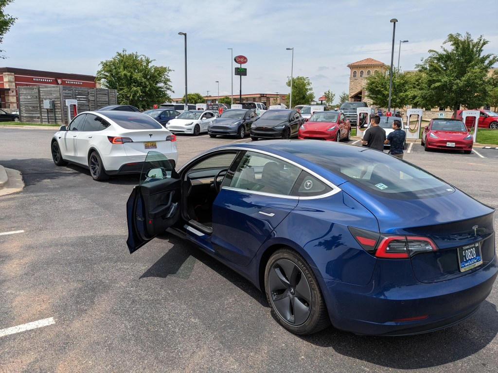 I kept the speed to about 70 to make sure we’d make Oklahoma City in one leg. The navigation routed us off I-40 onto side streets and then I-240. It turns out that this weekend I-40 was closed for construction through Oklahoma City so we followed the detour. When we arrived at Oklahoma City supercharger we were greeted with a line with just one ahead of us. It took about 15 minutes for a stall to open up.