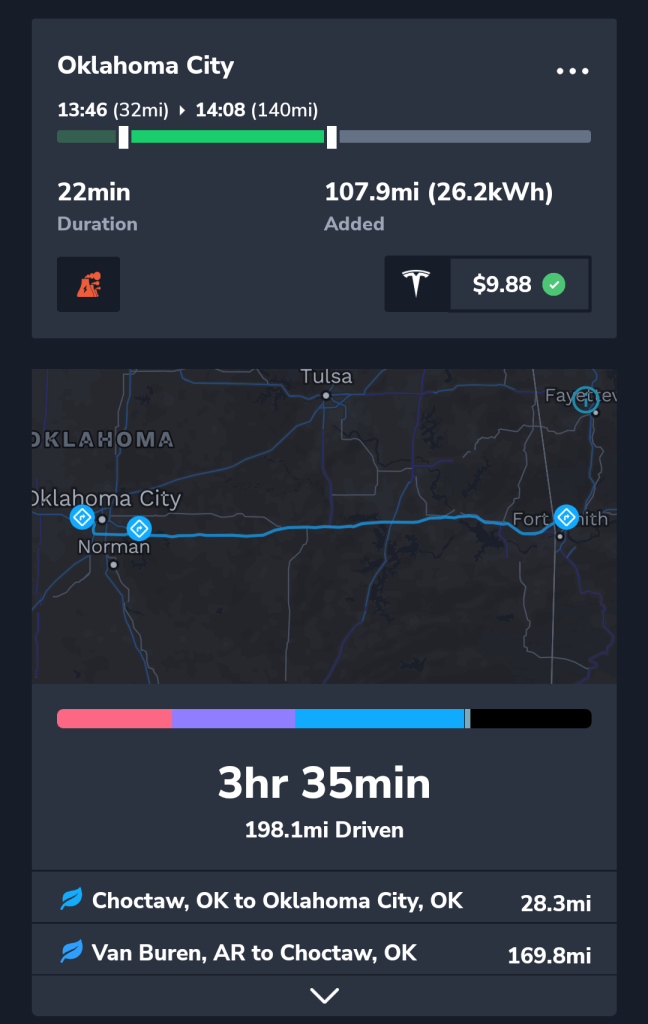 We slept late until 8 am and almost missed the breakfast at the Holiday Inn we stayed at. Today is the “big stretch” from Arkansas to Oklahoma City the longest stretch without another supercharger this entire trip. The cars nav told us to top off again prior to leaving, about 10 miles were used by sentry mode which records activity close to the car while parked overnight. We set off at 10 am to see how far we could go. As we crossed the state line into Oklahoma we were greeted by some of the worst roads we have ever traveled on. Such a stark contrast to Arkansas.