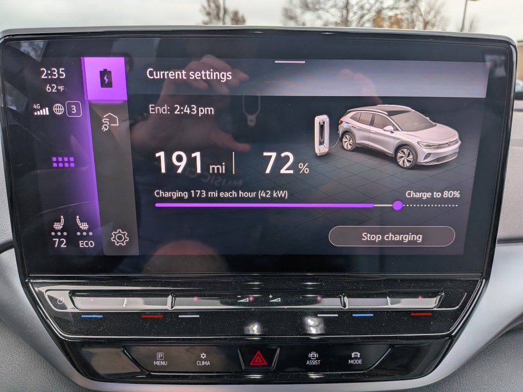 Te charge rate of 42 kW was poor due the battery being at a high state of charge. it took 10 minutes to add about 8%, at a lower state of charge the ID.4 should charge closer to 125 kW.